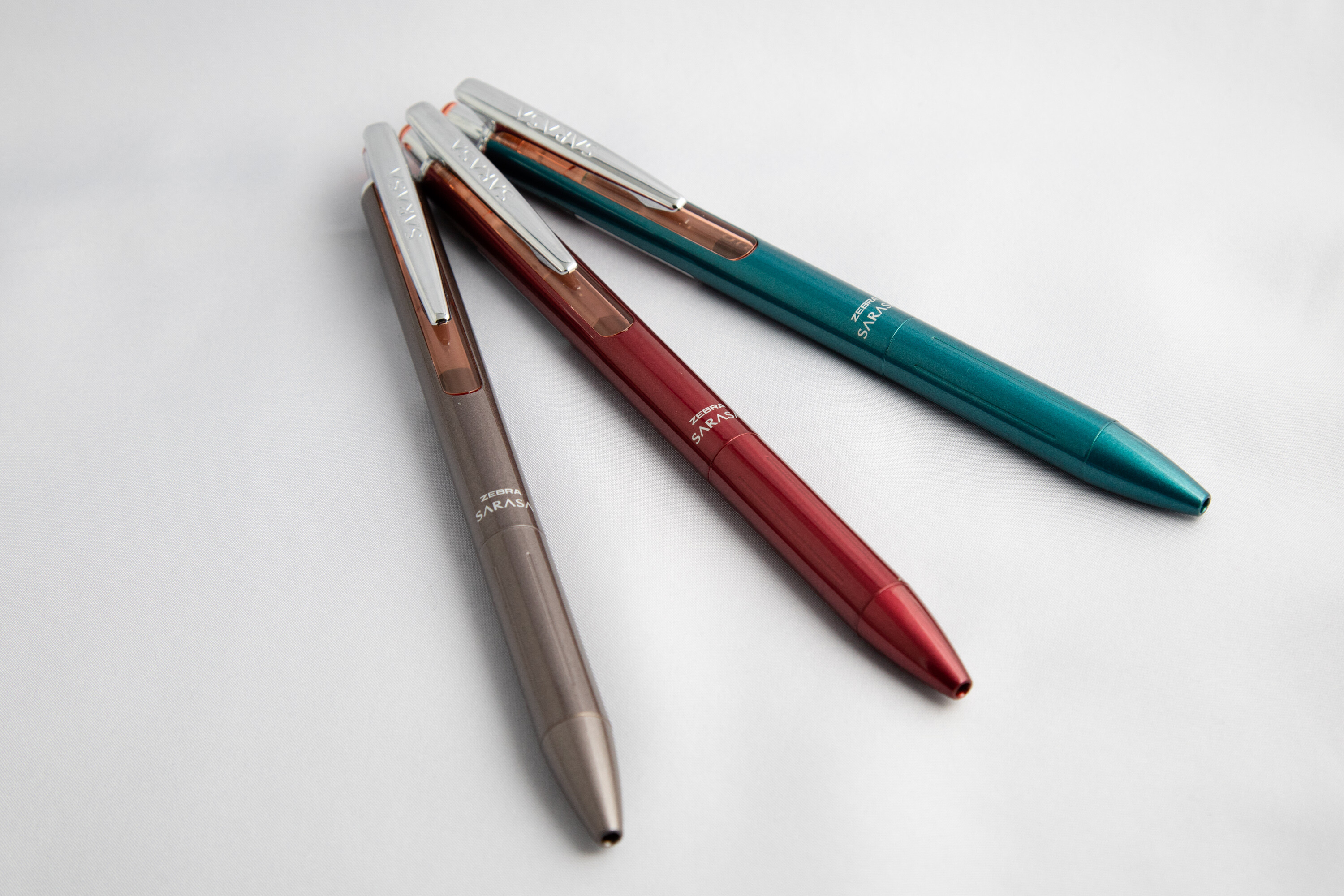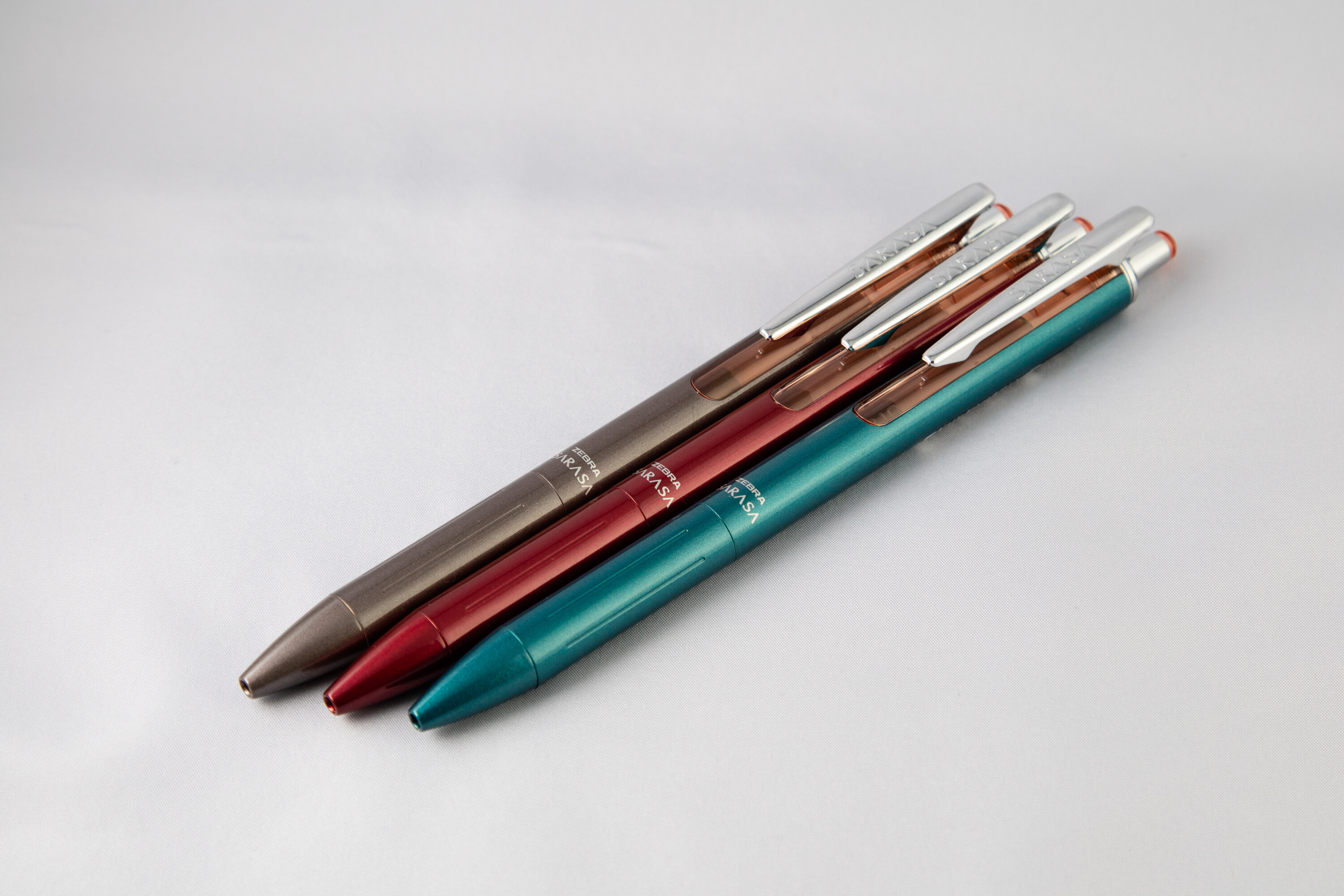左からブラウングレー、レッドブラック、グリーンブラックの三種類。いつもの限定カラーはインク色自体は普通のブラックなのですが、今回の限定モデルはインクも特別色(と言っても、同名のサラサクリップと同じ)になっています。