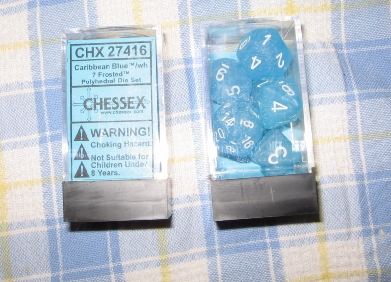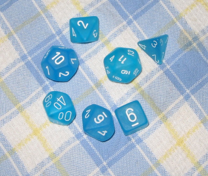 で、中身はこんな感じです。4面ダイス、6面ダイス、8面ダイス、10面ダイス、10面パーセントダイス(でいいのかな? 00〜90の目が書かれてます)、12面ダイス、20面ダイスの7つです。パーセントダイスとかは初めて実物を見ました…。