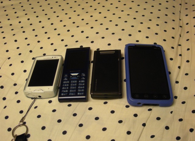 ということで、我が家の携帯電話勢ぞろい。右からSony Ericcson mini(イーモバイル)、今回買ったSC01S SOCIUS、同じく今回買ったWX340K、メインのHTC EVO WiMAX(au)。個人で4台(イエデンワと死蔵中のUSB通信ドングルも含めれば6台)というのは中々に酔狂の域ですね……。