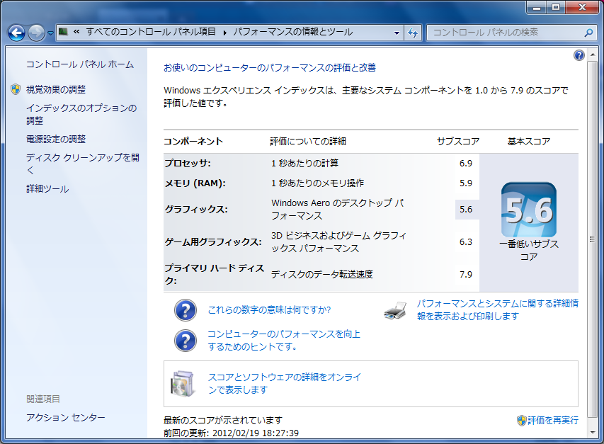 Windows エクスペリエンス インデックスも結構な値をたたき出しています。下手するとメインPCより高い項目もあるくらい。