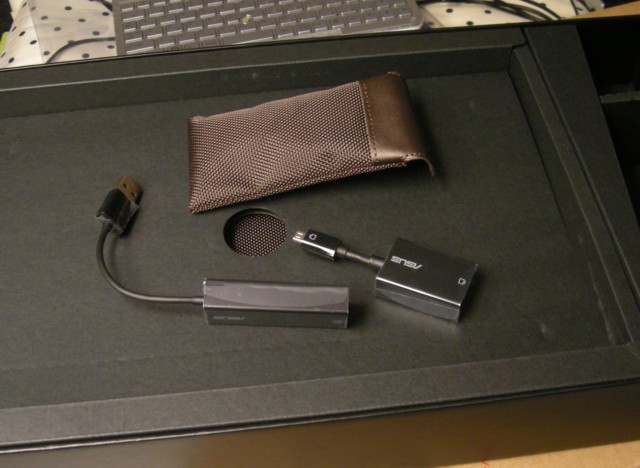 miniHDMI-VGAアダプターと有線LANアダプターは、キャリングケースと同じような感じのケースに入った状態で箱に収められています。正直使う機会が無いので(プレゼンとかしないし無線LAN無い環境に行かないしなぁ)、そのままケースに収めて箱の中へ。