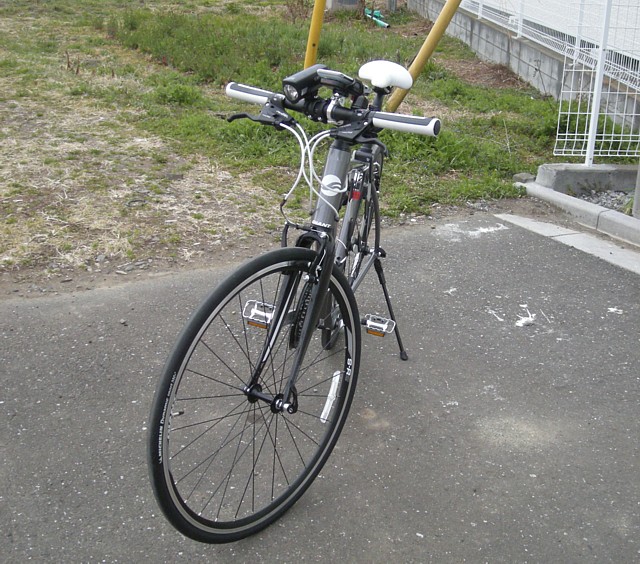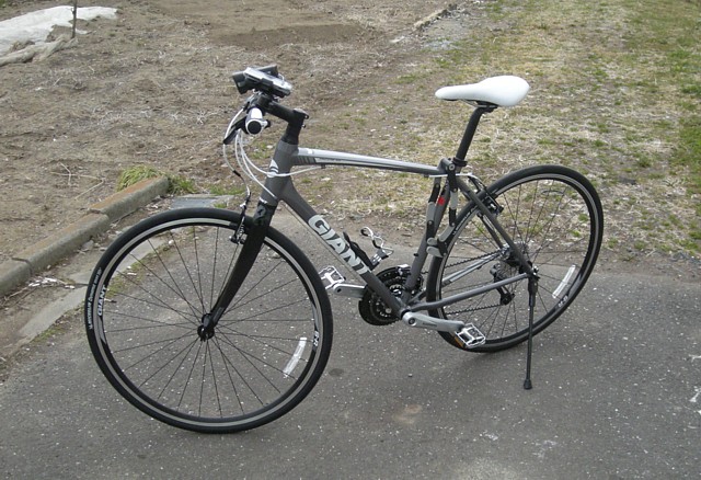最初からロードを! というお話もあったのですが、ママチャリでないスポーツサイクルは初めてなのでまずは中庸を、と言うところでクロスバイクをチョイス。コストパフォーマンスもよろしゅうございますし、ということで、GIANTのESCAPE RX2(ダークシルバー)を購入。