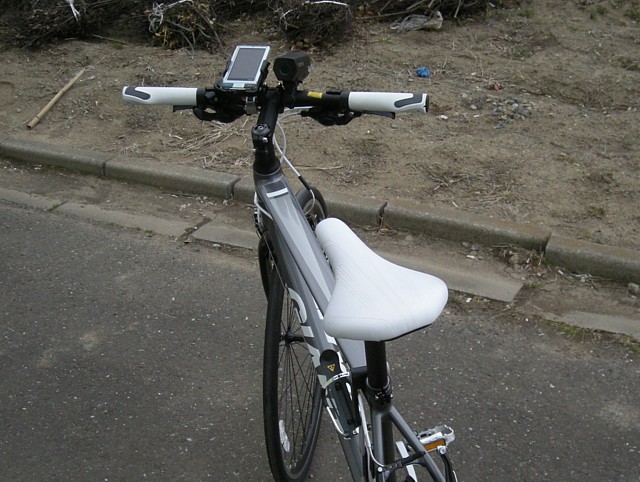 サドル側からのショット。ハンドルについているのは、右から標準のベル、iH-100Mでマウントしたスマートフォン(メインのEVOではなく、新しく購入したINFOBAR A01)、CATEYE HL-EL540です。この後さらにサイクルコンピューター(多分CATEYEのCC-RD400DW)が付き、サドル下にはサドルバッグが付く予定です。